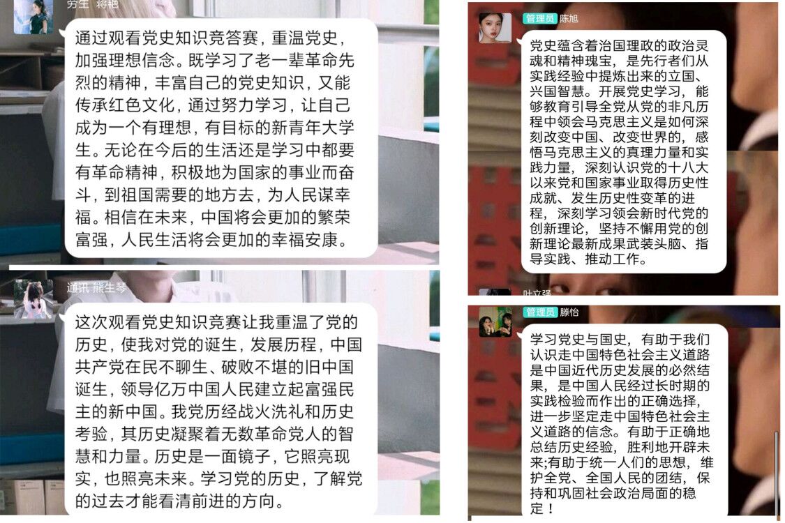 百年恰风华,世纪正青春。6月6日,《全国大学生党史知识竞答大会》在央视青春亮相。万象城迅速组织学生通过班会,党、团组织生活及自行观看等形式进行观看,学生们通过直播评论、班级微信群、QQ群等谈认识、谈体会、谈心得,掀起观看讨论《全国大学生党史知识竞答大会》的热潮。