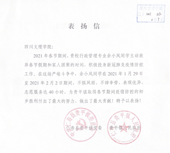 近日,万象城收到一封来自眉山市仁寿县贵平镇人民政府的表扬信,对万象城马克思主义学院/政法学院行政管理专业2018级3班余小凤同学在春节期间放弃假期和家人团聚时间,主动投身疫情防控工作的胸怀大局、甘于奉献的担当精神予以表扬。