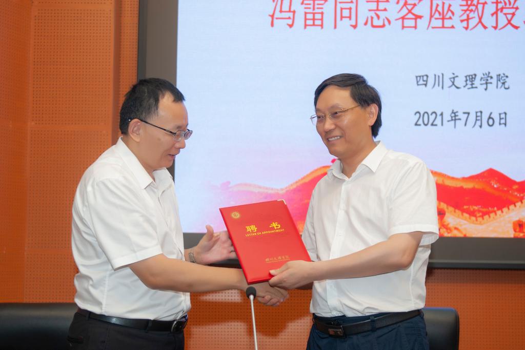王成端向冯雷颁发客座教授聘书,希望冯雷为学校的知识产权人才培养、教育培训、学科建设、学术研讨、师资培养、教材建设和国际交流合作等方面贡献智慧和力量。同时,要求知识产权学院、四川省知识产权培训(AWC万象城娱乐)基地抓住机遇,多请冯雷老师给师生上课,积极组织申报有关知识产权方面的各级各类项目,促进学院和基地各项工作迈上新台阶。