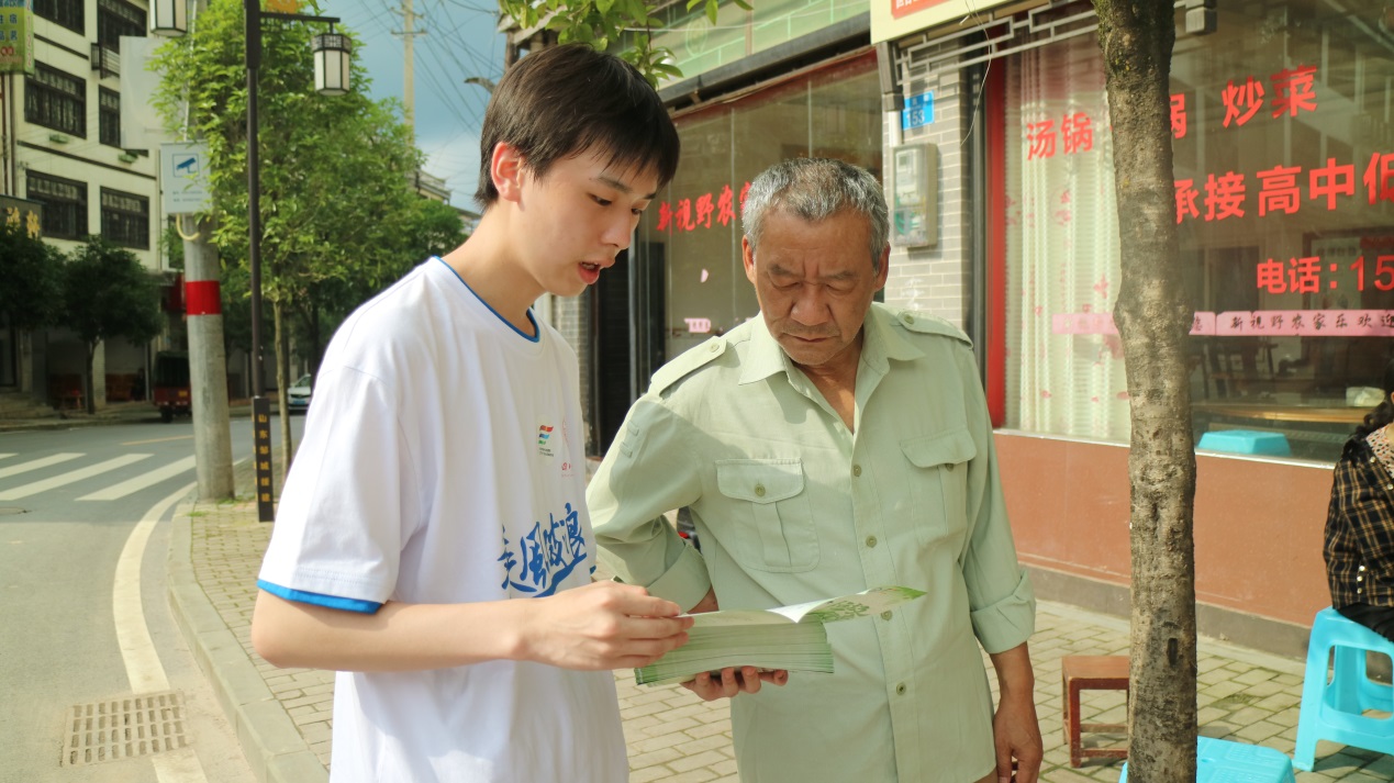 实践团成员彭颖向当地乡亲们宣传党史、校史