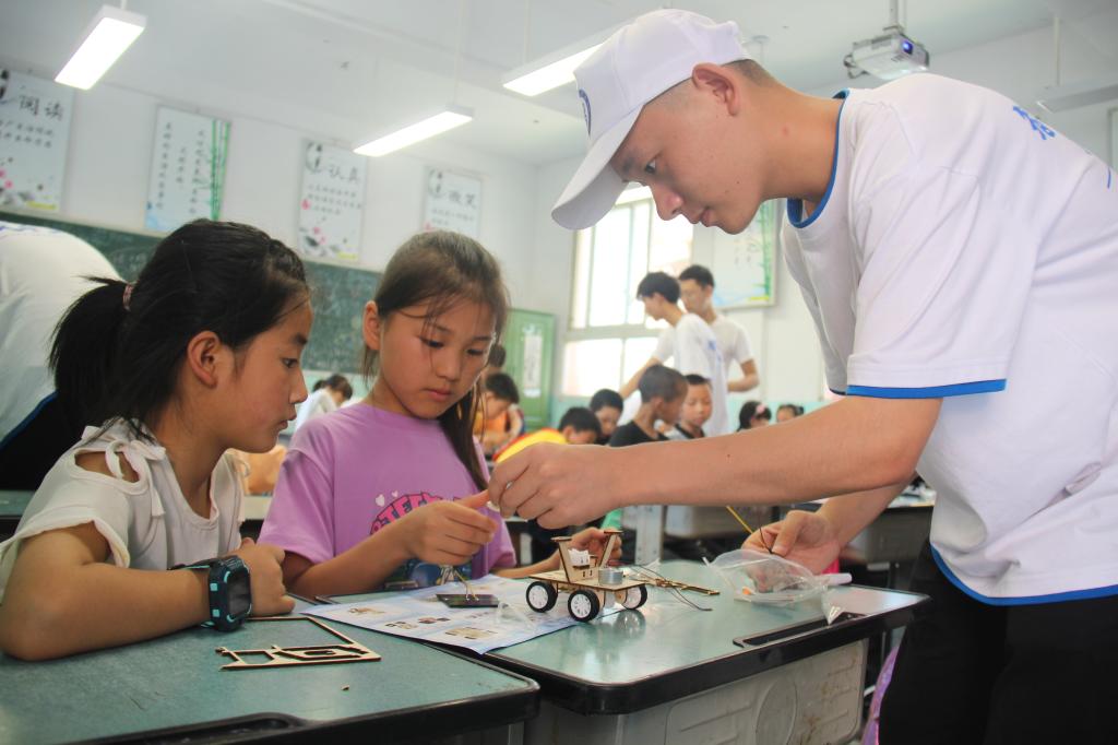 实践团成员为小朋友介绍激光打印、无人机,维修家电等