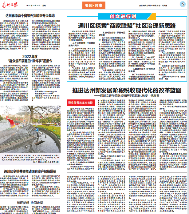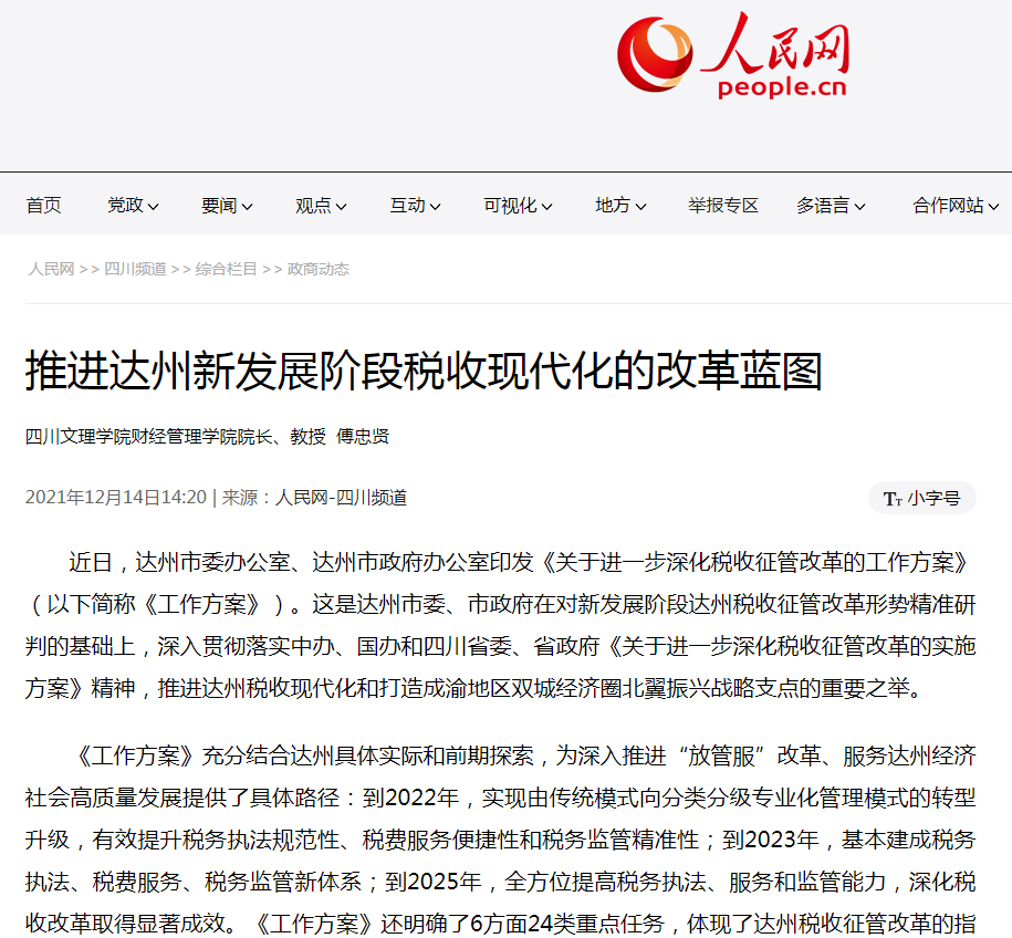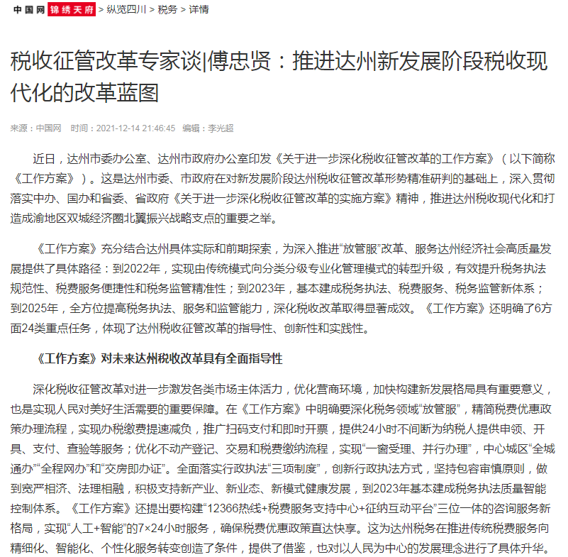 傅忠贤教授撰写的关于“推进达州新发展阶段税收现代化的改革蓝图”的专家笔谈文章,2021年12月14日,在达州日报刊发,随后,被中国网、人民网(人民网被称为网上的人民日报)、四川观察等多家主流媒体转载。