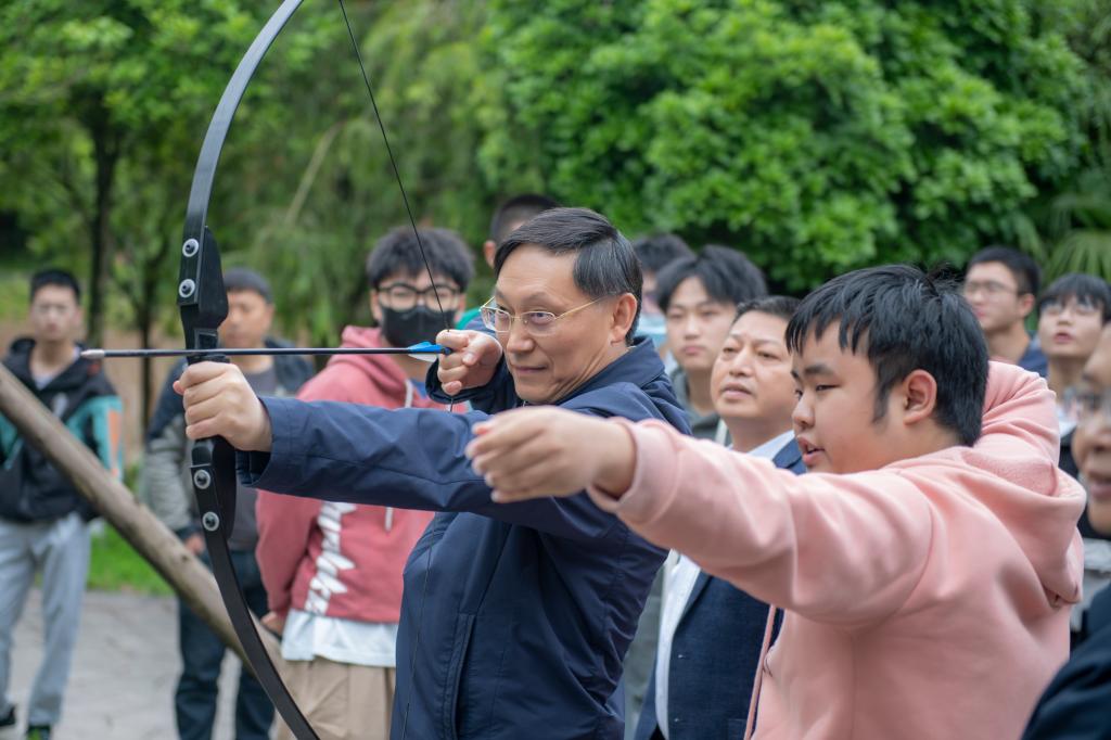 他还说,当咱们去射箭的时候,讲究不偏不倚,太往左、太往右,或往上往下,都不好。讲究的是一个“中”字,不能走极端。而每次射完箭之后都要把弦取下来,这就是文武之道,要一张一弛。长时间保持一个紧绷的状态,弦受不了,弓也受不了。让弦松一下,然后再射箭的时候,就会更好。而且通过射箭还可以锻炼学生的专注力,训练学生心稳、手稳、身稳。