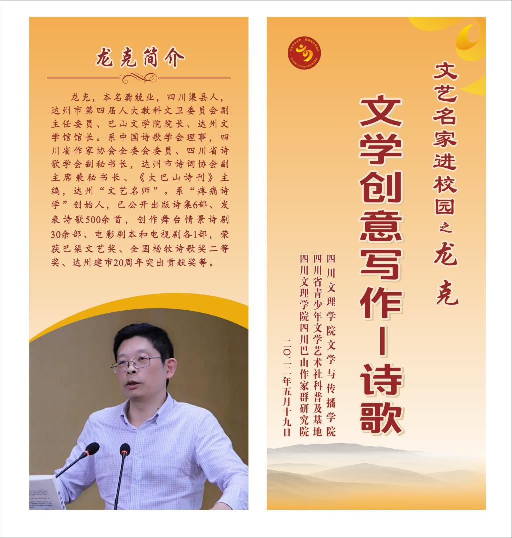5月19日,“文艺名家进校园”系列讲座的诗歌专题在莲湖校区艺术传媒大楼举办,巴山文学院院长、达州文学馆馆长龙克先生作题为“‘痛’与‘爱’绽放的花朵——我的‘诗学’理念及诗歌意境的开拓”的学术讲座。讲座由文传学院院长曾宪文教授主持。四川省青少年艺术社科普及基地主任赵定贵、文传学院副院长成立及汉语言文学专业部分师生聆听讲座,因疫情原因,相关专业学生通过腾讯会议线上观看了讲座。