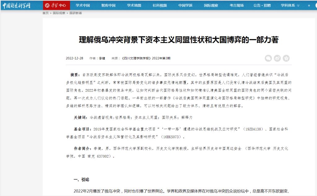 《理解俄乌冲突背景下资本主义同盟性状和大国博弈的一部力著》链接:http://www.cssn.cn/gjgc/gjgc_jwzz/202212/t20221228_5574753.shtml