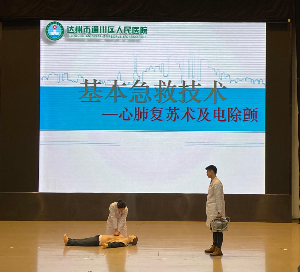 本次培训分理论知识宣讲和现场演示、分组技能训练三个环节。其中,理论知识宣讲和现场演示由通川区人民医院心内科莫春雷医生进行讲解和演示,内容涵盖心搏骤停及院外生存链、心肺复苏的定义、心肺复苏(CPR)的操作流程、AED(自动体外除颤仪)的使用和操作流程等内容,并进行操作示范。