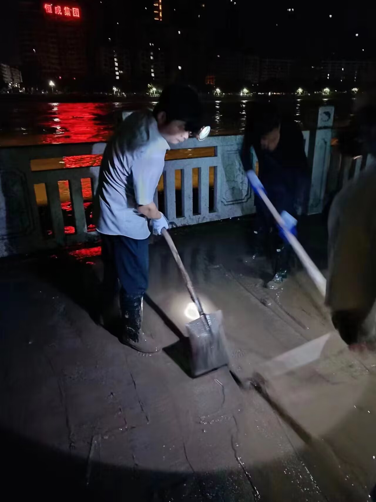 志愿者们实行分片包干,协同作战,按照“水退人进”原则,手持扫帚、铁锹、耙子、高压水枪,向淤泥、漂浮垃圾、沉积物发起总攻。清淤现场,没灯光照明,志愿者们自备电源照明,用铁铲将大量淤泥、垃圾铲到指定地点,把浸没在淤泥里的杂物抬出统一堆放,用水管冲洗地板路面,衣服被汗水浸透,身上满是泥浆,尽但是大家不怕脏、不怕苦、不怕累,不怕疲惫,持续奋战,直到凌晨5点,清淤工作结束。