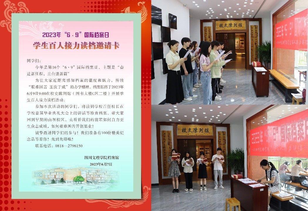 6月9日,国际档案日宣传在档案馆、校史馆和馆外同时展开。在档案馆,档案馆的老师们介绍了学生档案方面的知识,引导学生珍惜荣誉,避免处分。在校史馆,学校开展学生百人接力读档活动,学生读到首任校长在学校首届毕业典礼大会上的讲话等珍贵档案时,感叹道,读档案的过程让他们仿佛回到早期的南坝校区,看到学校的前辈如何自力更生、众志成城,如何艰难困苦开创基业。同时,在校园重要宣传点位布展宣传,让师生了解国际档案日的内容和精神,推动师生走进档案馆、走进校史馆,感知文理师生共同书写的校史华章。