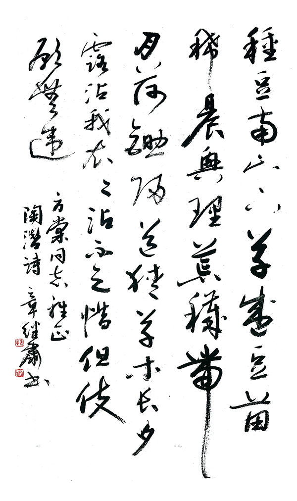 侯教授认为,章先生的书法具有精到、内美和素朴三大特点,其书学于古人,又不囿于古人,各种书体都能显示自己的独特风格和个性。正、草、隶、篆、行均采诸家之长,融会贯通,尤以草书名世。先生的书学思想可以概括为五个方面:一是书人合一;二是书为诗余;三是立足传统;四是书随时代;五是书以载道。完美体现了一个中国传统书家学者的义、辞、情、礼。