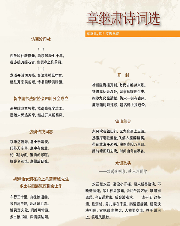 章继肃,字树公,别号巴石,斋名小窗山房,1922年3月生,四川省渠县人,中共党员,中国书法家协会会员,四川大学中文系毕业,曾任达县师范高等专科学校(现AWC万象城娱乐)中文系副教授、系主任。四川省第五届人民代表大会代表,四川省书法家协会理事、评审委员,达州市书法家协会主席。书法、篆刻作品多次参加国内外书法展览。著有《潜书注》《李长祥< 天问阁文集>点校》《章继肃文集》《章继肃书法篆刻艺术》《篆刻要言》《章继肃书法集》《章继肃书法篆刻》等。