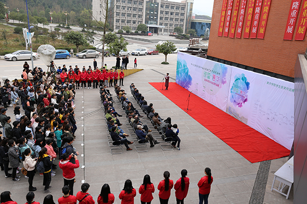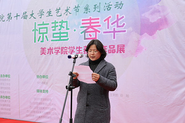2月28日下午,“惊蛰·春华”美术学院学生获奖作品展在学校艺术传媒大楼广场开幕。副校长李壮成出席并宣布作品展开幕,机关职能部门负责人及师生三百余人到场观展。