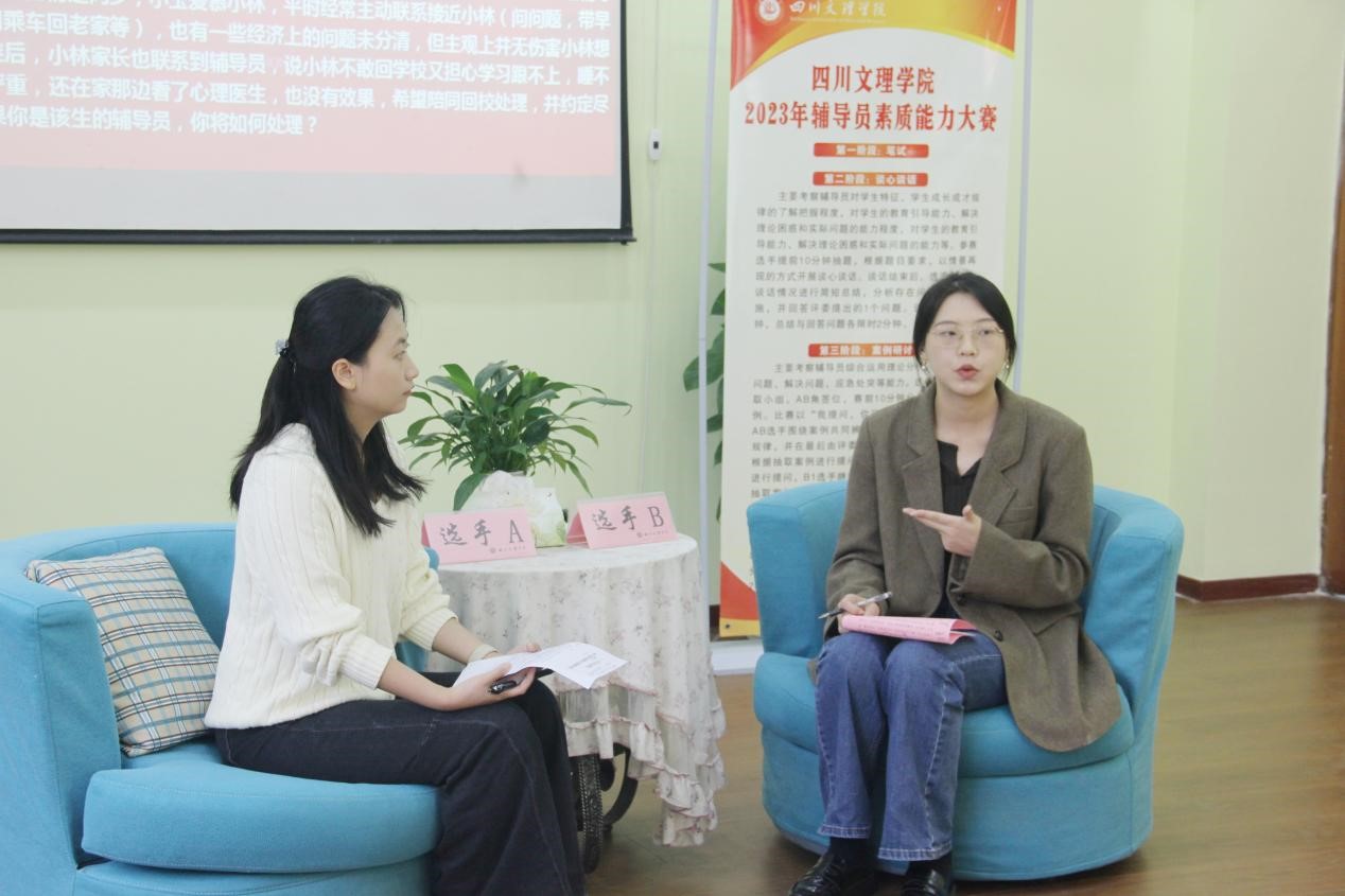 谈心谈话环节创设多个师生日常交互场景,以考察辅导员对学生特征、学生成长成才规律的了解把握程度,对学生的教育引导能力、解决理论困惑和实际问题的能力。在比赛现场,气氛轻松愉悦,“问题百出、性格各异、想法多样”的“演员”学生感同身受地表达自身观点,鲜活地还原了辅导员工作的场景,参赛选手们用温和的话语,有理有据、有理有情、循序渐进地解决同学们的疑惑并指引未来的发展方向。文学与传播学院肖旭精准切入,由点到面、由浅到深地为同学剖析了师生恋的不可能性,并从个人、学生角度出发,做好学习规划,引导学生形成正确的恋爱观和发展观。智能制造学院李林在面对入党失败而心理失衡的学生时,选择从学生的日常学习、生活为切入口,了解入党失败的原因,劝诫学生要端正入党动机,调整心态,持续提升自己,争取早日入党。