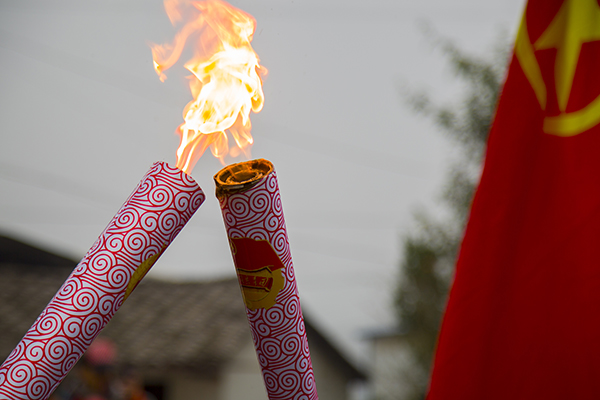侯忠明点燃火炬并交给火炬手代表,“一二·九”爱国火炬接力运动正式开始。