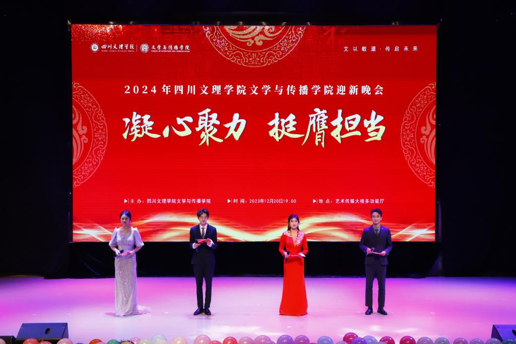 12月20日晚,文学与传播学院在莲湖校区艺术传媒楼多功能厅举行以“凝心聚力,挺膺担当”为主题的迎新晚会,学校党委副书记、纪委书记帅胤,副校长徐晓宗、程碧英出席,相关职能部门负责人及达州市高级中学、通川区第七中学、通川区第八中学、达州公安局等单位嘉宾和学院全体师生到场观看。