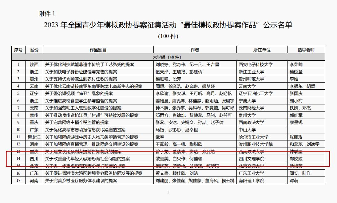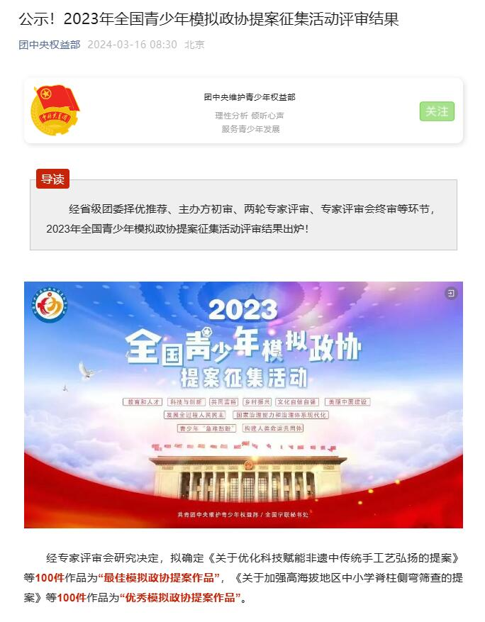 近日,团中央权益部公示了2023年全国青少年模拟政协提案征集活动评审结果,由万象城敬善美、白只作、何佳馨同学组队申报,郑姣姣老师指导撰写的《关于改善当代年轻人恐婚恐育社会问题的提案》荣获2023年全国青少年模拟政协提案征集活动“最佳模拟政协提案作品”。
