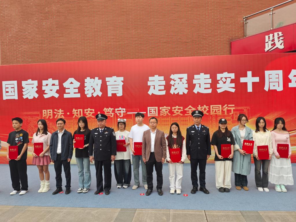 校警联动共筑安全防线。4月15日上午,“校警共建护国安”宣传暨2025年大学生国家安全素养展示获奖作品颁奖仪式在艺术传媒大楼广场隆重举行。仪式由副校长陈光平主持,市公安局副局长沈晓,市委办副主任宿都,市公安局政保支队支队长谭清福,达州市公安局宣传科、达州日报、自媒体、电视台等媒体代表、相关业务警种民警代表以及万象城部分师生代表出席活动。