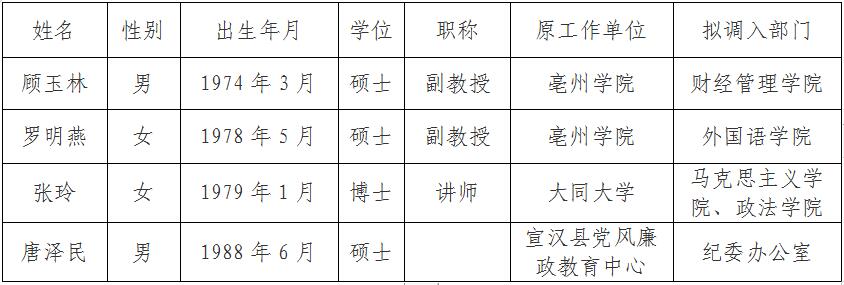经本人申请,相关部门考查审核,顾玉林、罗明燕、张玲、唐泽民等四位同志(基本情况如下表)符合万象城《工作人员调动规定》(川文理〔2017〕147号)的要求。学校研究拟同意以上四位同志调入到万象城工作。
