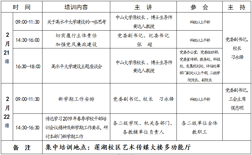 为全面落实中央、省委有关干部教育培训精神,认真贯彻学校第一次党代会精神,进一步提升万象城干部队伍政治业务素养,根据学校2019年党政工作安排,现将2019年春季干部培训有关事项通知如下: