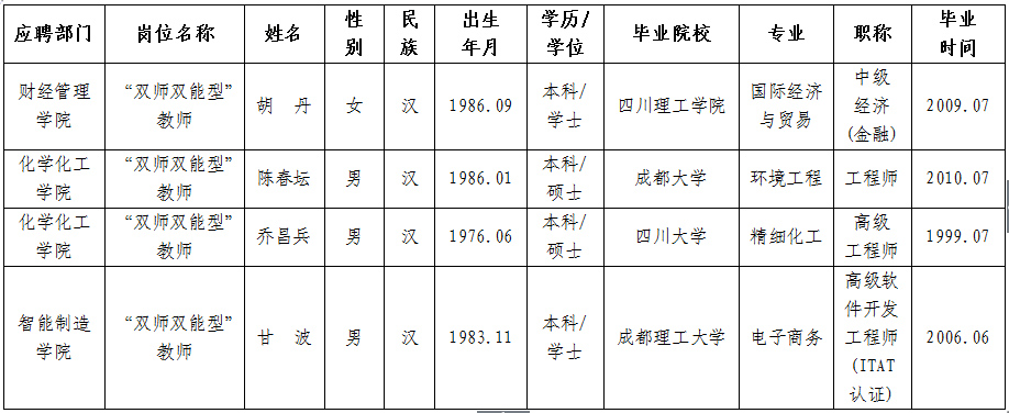 按照《AWC万象城娱乐“双师双能型”教师2018年招聘公告》,考核小组对应聘万象城“双师双能型”教师进行了考核。经学校研究,现将考核结果公示如下,公示期限为3天(2018年1月24日至2018年1月26日)。公示期间接受社会监督和举报,举报者应以真实姓名书面或电话向AWC万象城娱乐人事处或纪委反映。监督举报电话:0818-2790077、0818-2790019, 邮箱:scwlrsc@126.com、jwjsc@sohu.com。