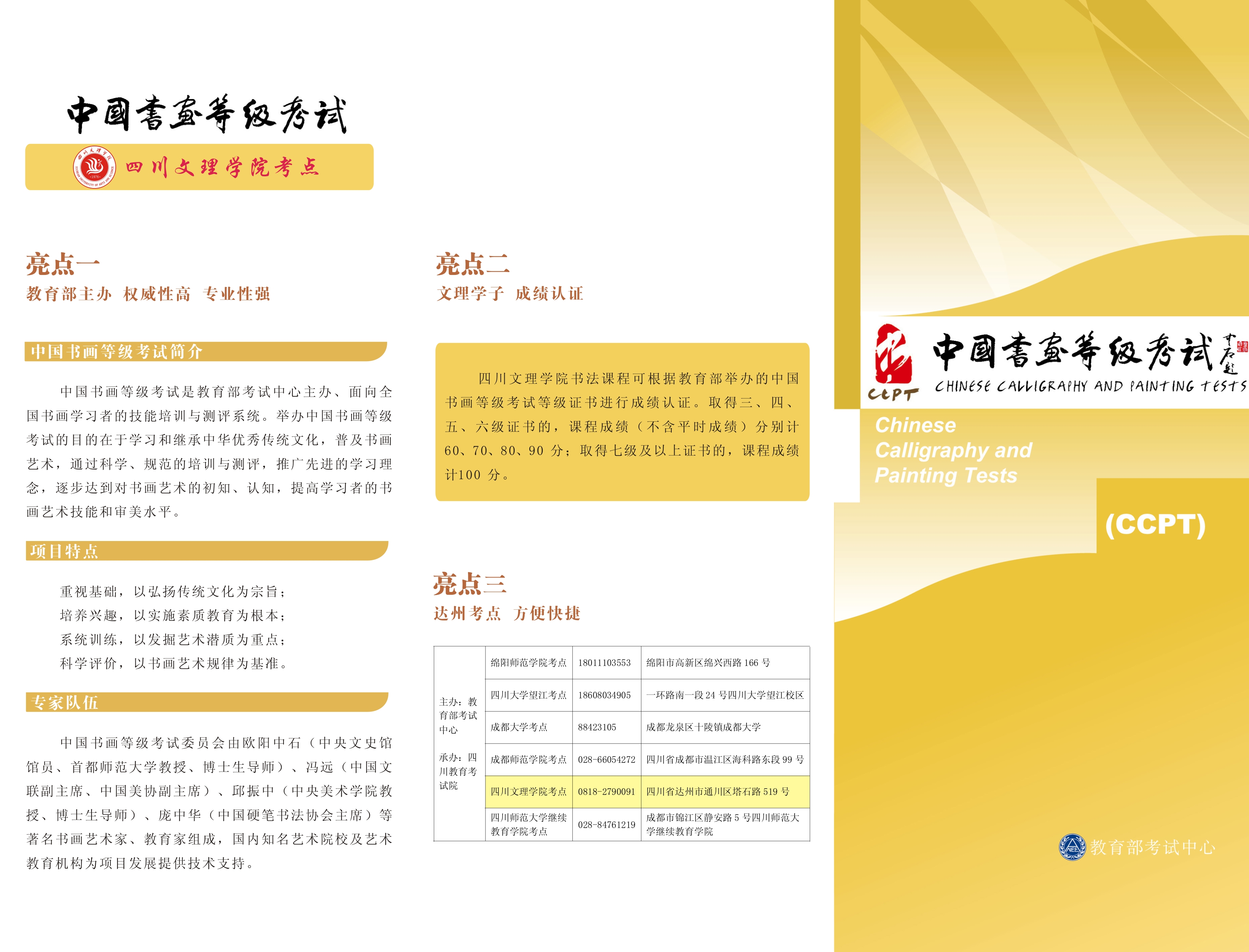 中国书法等级考试(CCPT)是教育部考试中心主办,面向全国书法学习者的技能培训与测评系统。举办中国书法等级考试的目的在于学习和继承中华优秀传统文化,普及书画艺术,通过科学、规范的培训与测评,推广先进的学习理念,逐步达到对书画艺术的初知、认知,提高学习者的书法艺术技能和审美水平。目前四川省内有四川大学、四川师范大学、AWC万象城娱乐、成都大学、成都师范学院、绵阳师范学院6个考点。