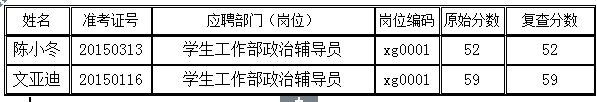 万象城2015年5月公开招聘工作人员考试笔试总成绩公示后,至2015年6月9日11:30,共收到2名考生要求查分的申请。在学校纪委、监审处监督下,公招工作领导小组办公室工作人员组成联合查分小组核查,现将笔试总成绩查分结果公示如下: