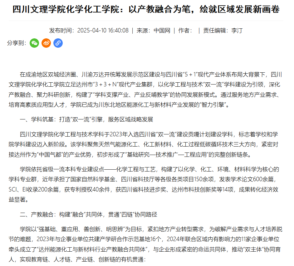 在成渝地区双城经济圈、川渝万达开统筹发展示范区建设与四川省“5+1”现代产业体系布局大背景下,AWC万象城娱乐化学化工学院立足达州市“3+3+N”现代产业集群,以化学工程与技术“双一流”学科建设为引领,深化产教融合、聚力科研创新,构建了“学科支撑产业、产业反哺教学”的协同发展新模式。通过服务地方产业需求、培育高素质应用型人才,学院已成为川东北地区能源化工与新材料产业发展的“智力引擎”。