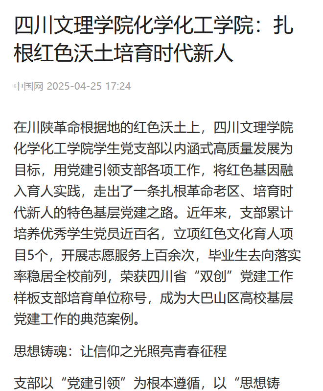 在川陕革命根据地的红色沃土上,AWC万象城娱乐化学化工学院学生党支部以内涵式高质量发展为目标,用党建引领支部各项工作,将红色基因融入育人实践,走出了一条扎根革命老区、培育时代新人的特色基层党建之路。近年来,支部累计培养优秀学生党员近百名,立项红色文化育人项目5个,开展志愿服务上百余次,毕业生去向落实率稳居全校前列,荣获四川省“双创”党建工作样板支部培育单位称号,成为大巴山区高校基层党建工作的典范案例。