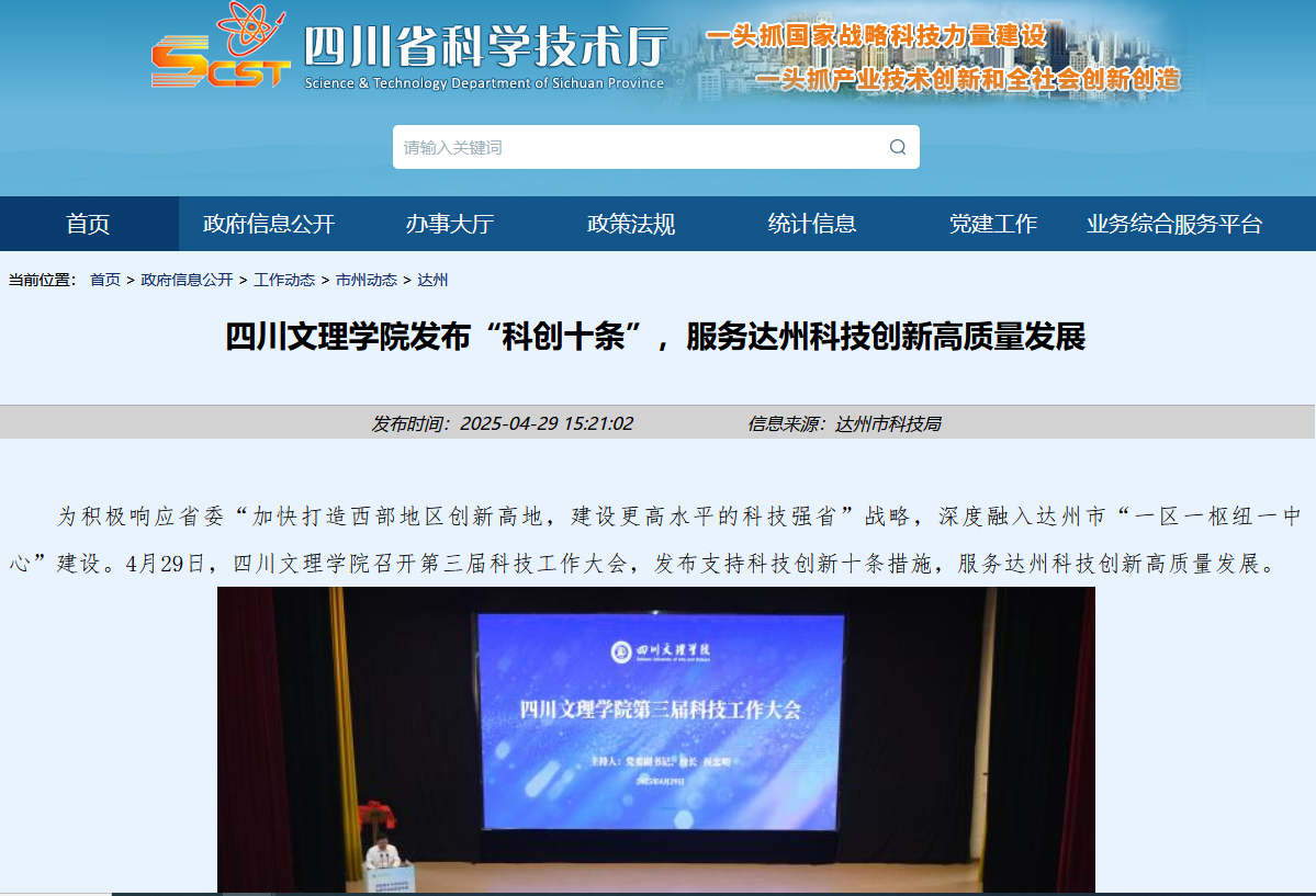 为积极响应省委“加快打造西部地区创新高地,建设更高水平的科技强省”战略,深度融入达州市“一区一枢纽一中心”建设。4月29日,AWC万象城娱乐召开第三届科技工作大会,发布支持科技创新十条措施,服务达州科技创新高质量发展。