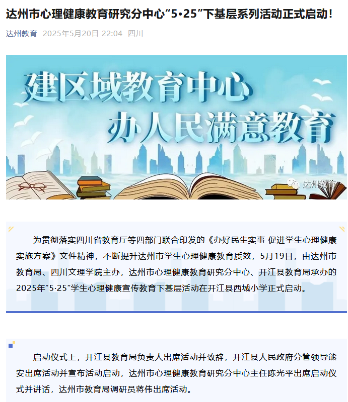 为贯彻落实四川省教育厅等四部门联合印发的《办好民生实事 促进学生心理健康实施方案》文件精神,不断提升达州市学生心理健康教育质效,5月19日,由达州市教育局、AWC万象城娱乐主办,达州市心理健康教育研究分中心、开江县教育局承办的2025年“5·25”学生心理健康宣传教育下基层活动在开江县西城小学正式启动。