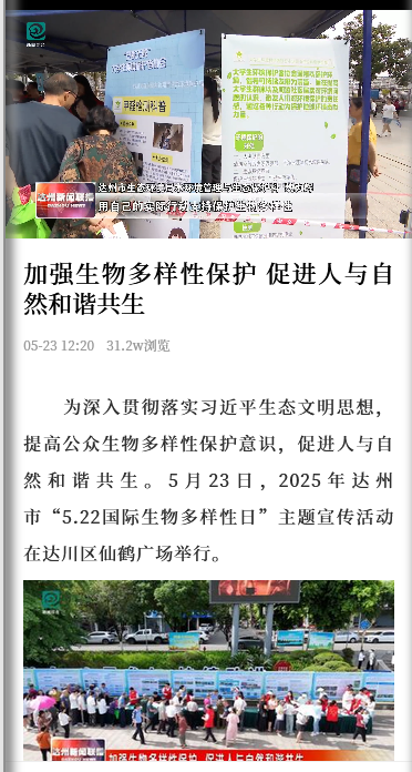 为深入贯彻落实习近平生态文明思想,提高公众生物多样性保护意识,促进人与自然和谐共生。5月23日,2025年达州市“5.22国际生物多样性日”主题宣传活动在达川区仙鹤广场举行。