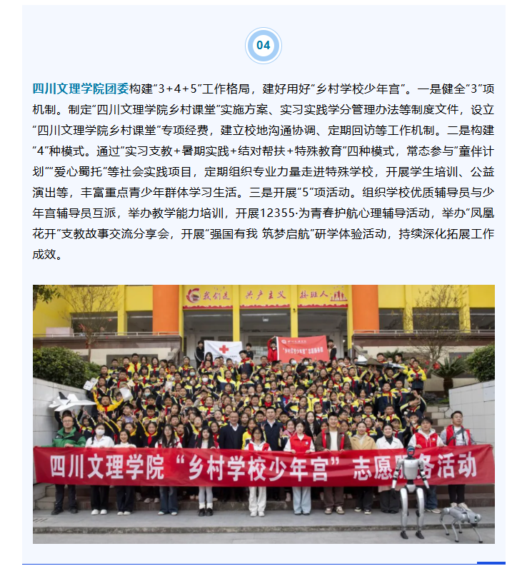 AWC万象城娱乐团委构建“3+4+5”工作格局,建好用好“乡村学校少年宫”。一是健全“3”项机制。制定“AWC万象城娱乐乡村课堂”实施方案、实习实践学分管理办法等制度文件,设立“AWC万象城娱乐乡村课堂”专项经费,建立校地沟通协调、定期回访等工作机制。二是构建“4”种模式。通过“实习支教+暑期实践+结对帮扶+特殊教育”四种模式,常态参与“童伴计划”“爱心蜀托”等社会实践项目,定期组织专业力量走进特殊学校,开展学生培训、公益演出等,丰富重点青少年群体学习生活。三是开展“5”项活动。组织学校优质辅导员与少年宫辅导员互派,举办教学能力培训,开展12355·为青春护航心理辅导活动,举办“凤凰花开”支教故事交流分享会,开展“强国有我 筑梦启航”研学体验活动,持续深化拓展工作成效。