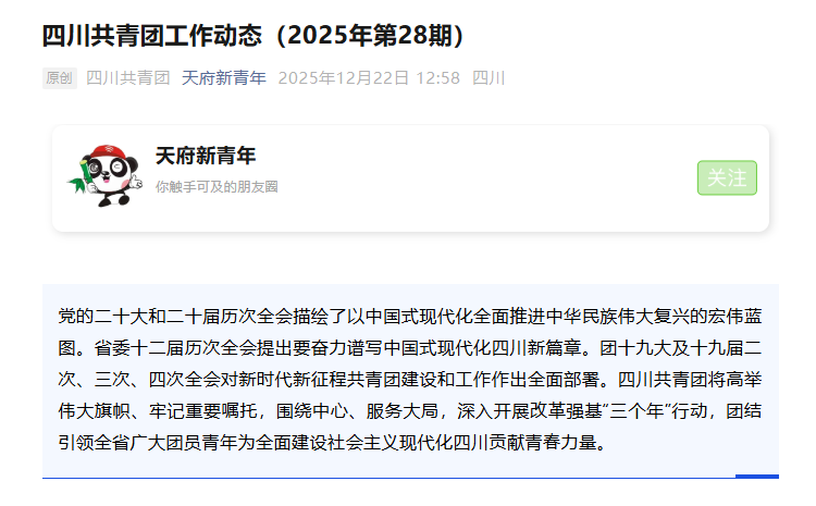 12月22日,四川共青团工作动态2025年第28期“各地特色亮点工作”栏报道万象城团委工作成效。全文如下: