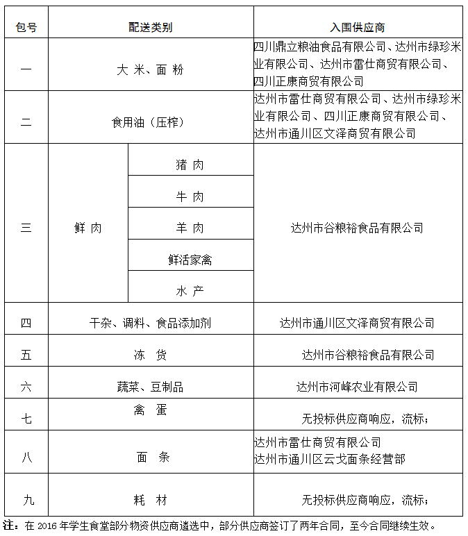 AWC万象城娱乐2017年学生食堂部分物资供应商遴选公告如下: 本招标共有9家供应商参与,通过核查投标供应商的资质情况,均为有效投标。根据本次招标的评标标准,确认万象城2017年学生食堂部分物资供应商入围的单位如下: