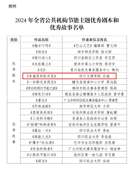 近日,为深入学习贯彻习近平生态文明思想,积极传播绿色发展理念,省机关事务管理局、省文联联合开展了2024年公共机构节能主题优秀剧本和故事征集活动。万象城文学与传播学院白海老师的作品《幸福里的牡丹花》成功入选优秀剧本。