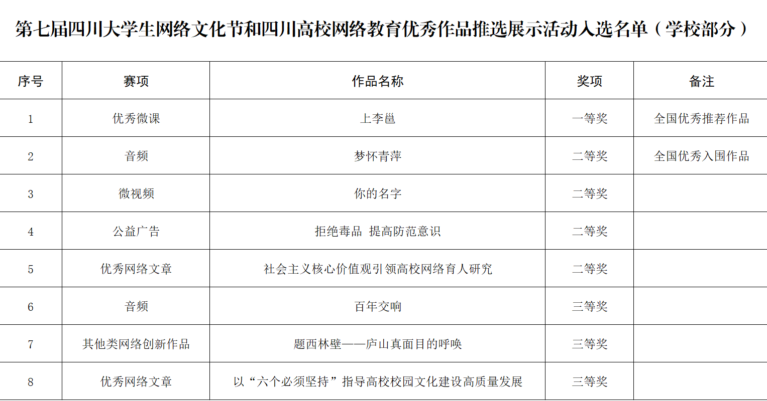 近日,中共四川省委教育工作委员会、中共四川省委网络安全和信息化委员会办公室公布了第七届四川大学生网络文化节和四川高校网络教育优秀作品推选展示活动入选名单。万象城8件作品成功入选并获奖。