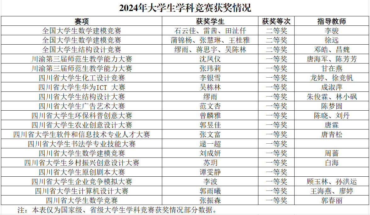 近日,四川省教育厅公布了2024年省级本科高校大学生竞赛获奖名单,万象城在43个省级赛项中共获奖648项,其中一等奖74项、二等奖228项、三等奖346项,梁弼、白海、周蔷、唐海军、龙婷、成淑萍等90人次获评优秀指导教师,学校获“优秀组织奖”“优秀组织单位”等称号。
