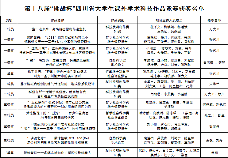 本届大赛,共吸引四川省121所高校、18万余名青年学生参与,共计报送2.2万件作品,近1400件作品进入省赛初评,505件作品进入省赛终审决赛。经过激烈角逐,万象城获一等奖4项,二等奖1项,三等奖7项,推荐的12个项目全部获奖,再创万象城“挑战杯”省赛成绩历史新高。