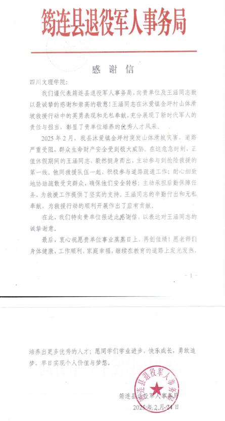 筠连县退役军人事务局在感谢信中提到:“王涵同学的英勇表现,不仅彰显了新时代军人的责任担当,更体现了贵校立德树人的卓越成效。”信中强调,学院优秀学子在关键时刻“站得出、顶得上”,展现了德育教育与社会实践深度融合的成果。