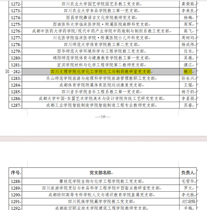 2024年9月,化学化工学院化工与制药教研室党支部成功入选全国高校“双带头人”教师党支部书记“强国行”专项行动团队。本次入选是学院长期坚持党建引领,推动党建和业务深度融合的结果,实现了学院在国家级党建荣誉上的突破。化工与制药教研室党支部先后荣获省、市、校三级“先进基层党组织”荣誉称号,支部书记工作室获评为省、校两级“双带头人”教师党支部书记工作室。近年,支部成员获四川省科技进步奖等奖项10项,立项各类科研项目30余项,发表论文近100篇,申请专利30余件,成果转化创造了较好的经济、社会和环保效益。